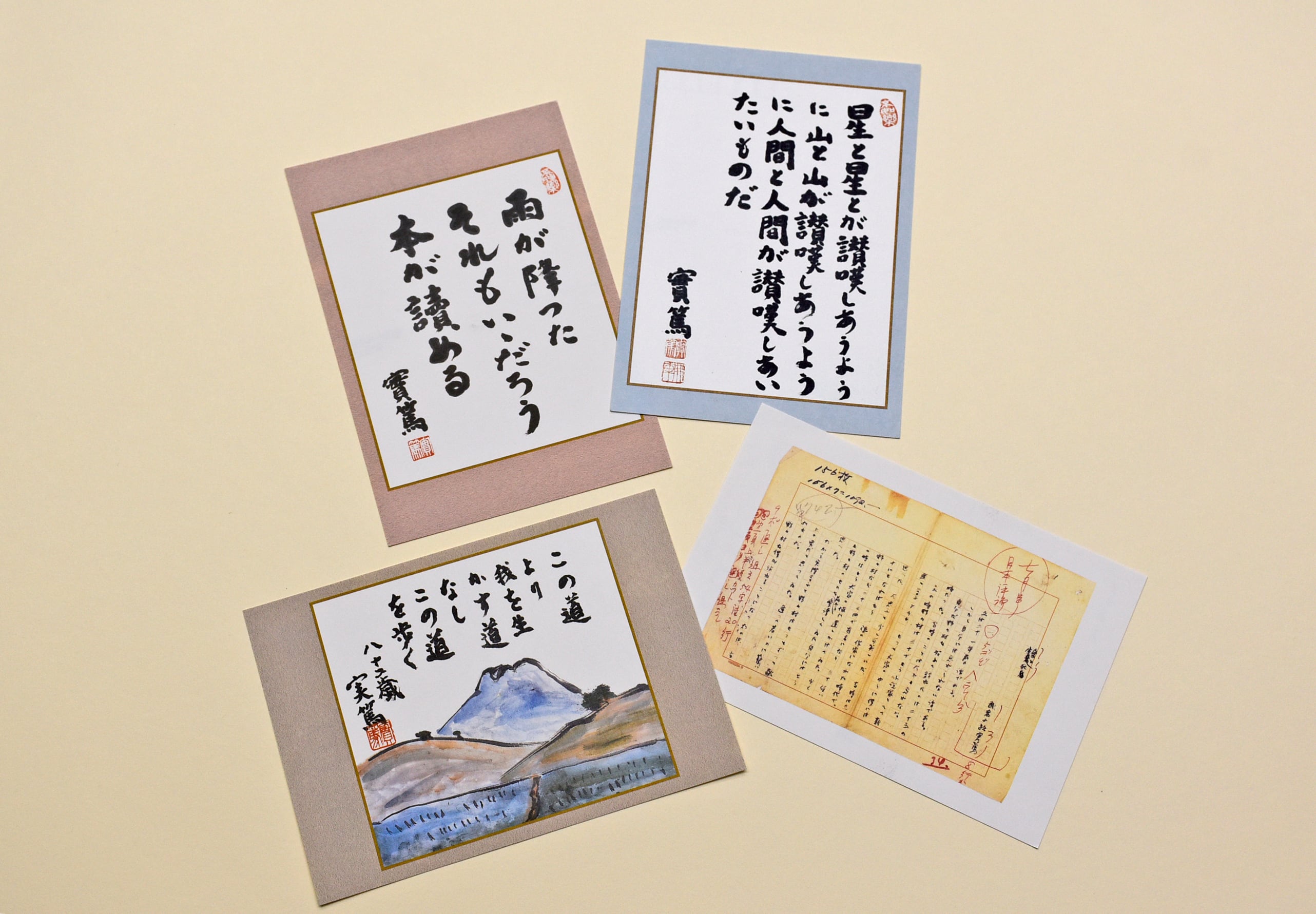 実篤の名言や原稿を中心にした絵葉書4枚セットです。