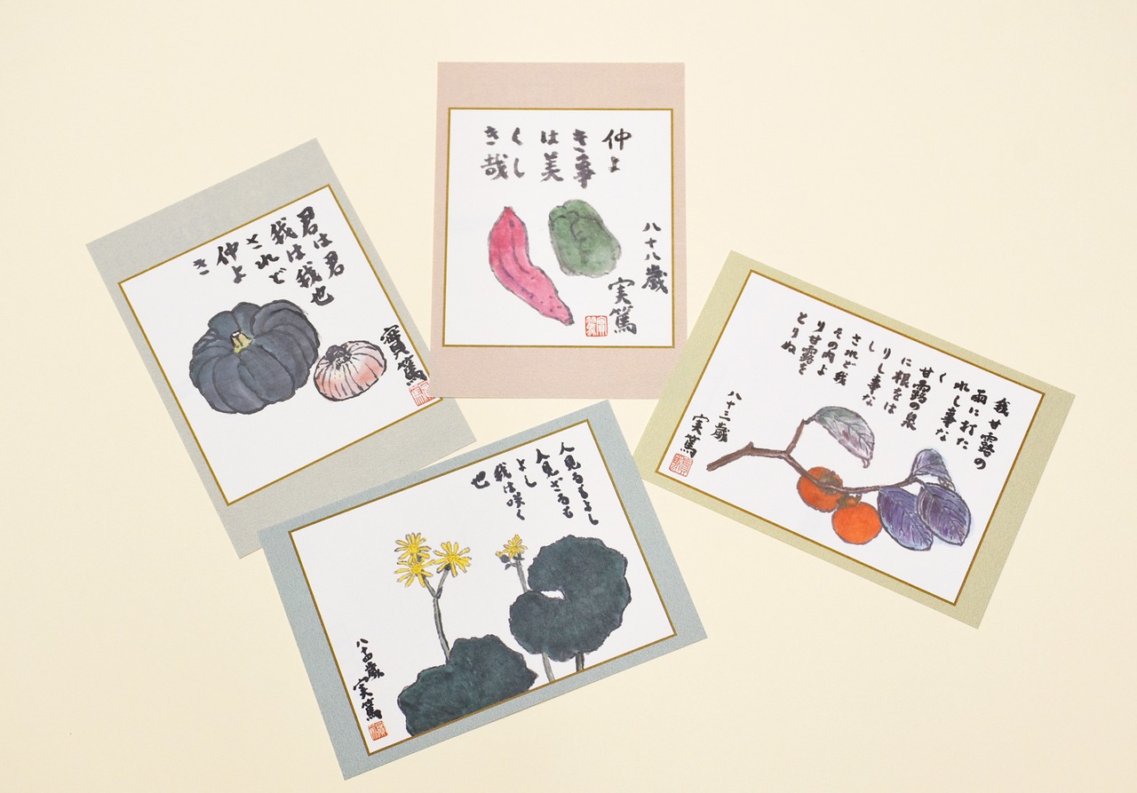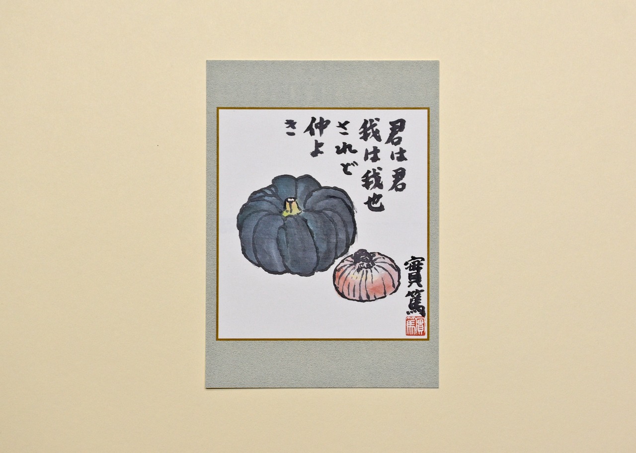 絵葉書4枚セット(秋冬)では、実篤が亡くなるまで暮らしていた旧邸のある実篤公園でもご覧いただけるつわぶきや柿、また、さつまいもなど秋の野菜や果物を中心にそろえました。淡彩で描かれた野菜図『仲良き事は』は、ピーマンとさつまいもの画に、名言「仲よき事は美くしき哉」が添えられています。