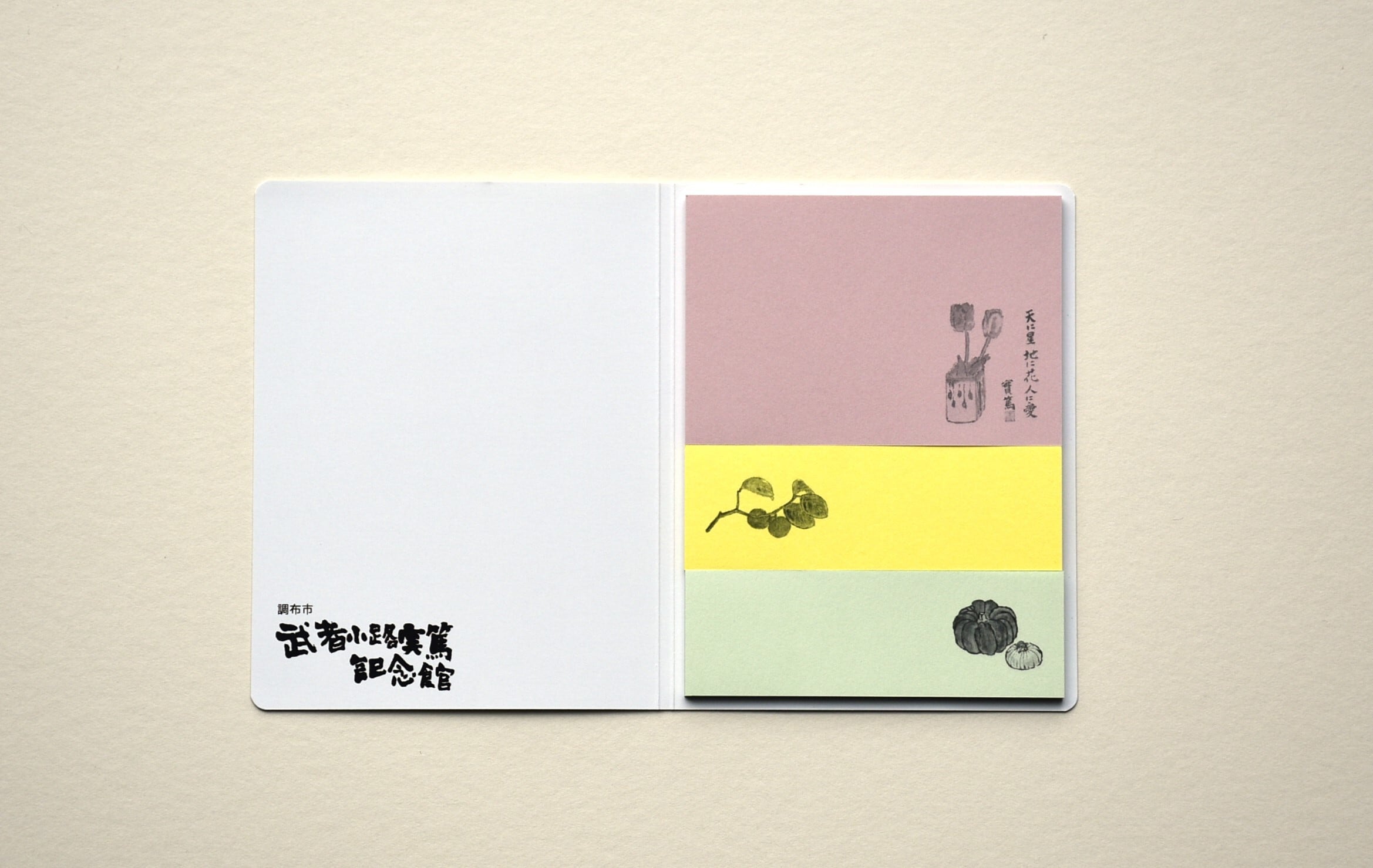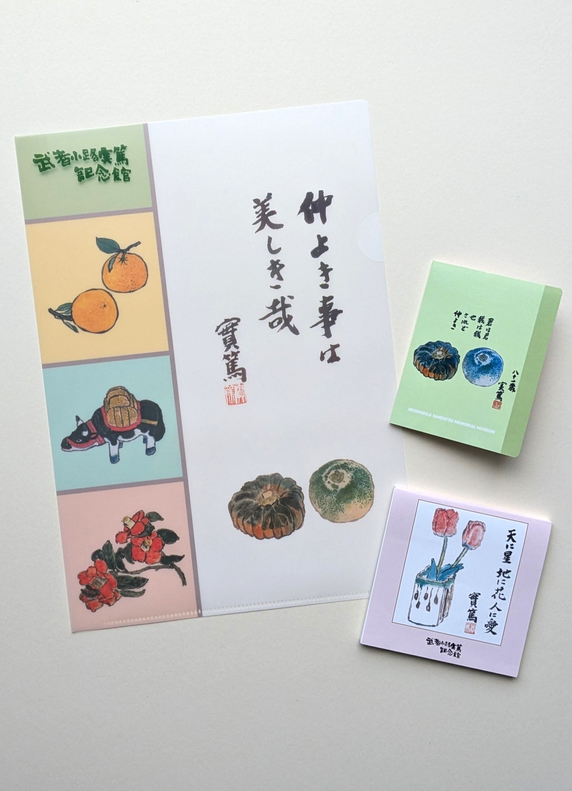 実篤記念館のミュージアムグッズのなかでもとくに人気のある文房具「クリアファイル」と「付箋ブック」「メモ帳」3点を揃えました。