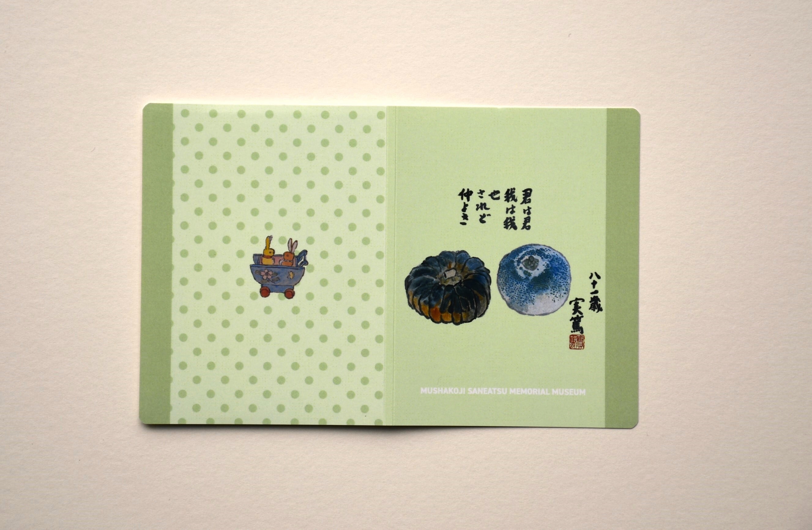 ちょっとした贈り物におすすめしたい、実篤記念館の人気文房具を3点セットにしました。2024年4月よりデザインを一新した付箋ブックは、裏表紙に兎を乗せた乳母車を描いた絵『童心』があしらわれています。実篤の画としては珍しい、可愛らしい絵柄が特徴的です。メモ帳には、実篤が描いた「南瓜」「バラ」「張子牛」「柿」の画が入ったメモが12枚ずつ入っており、さまざまな場面で活用できます。
