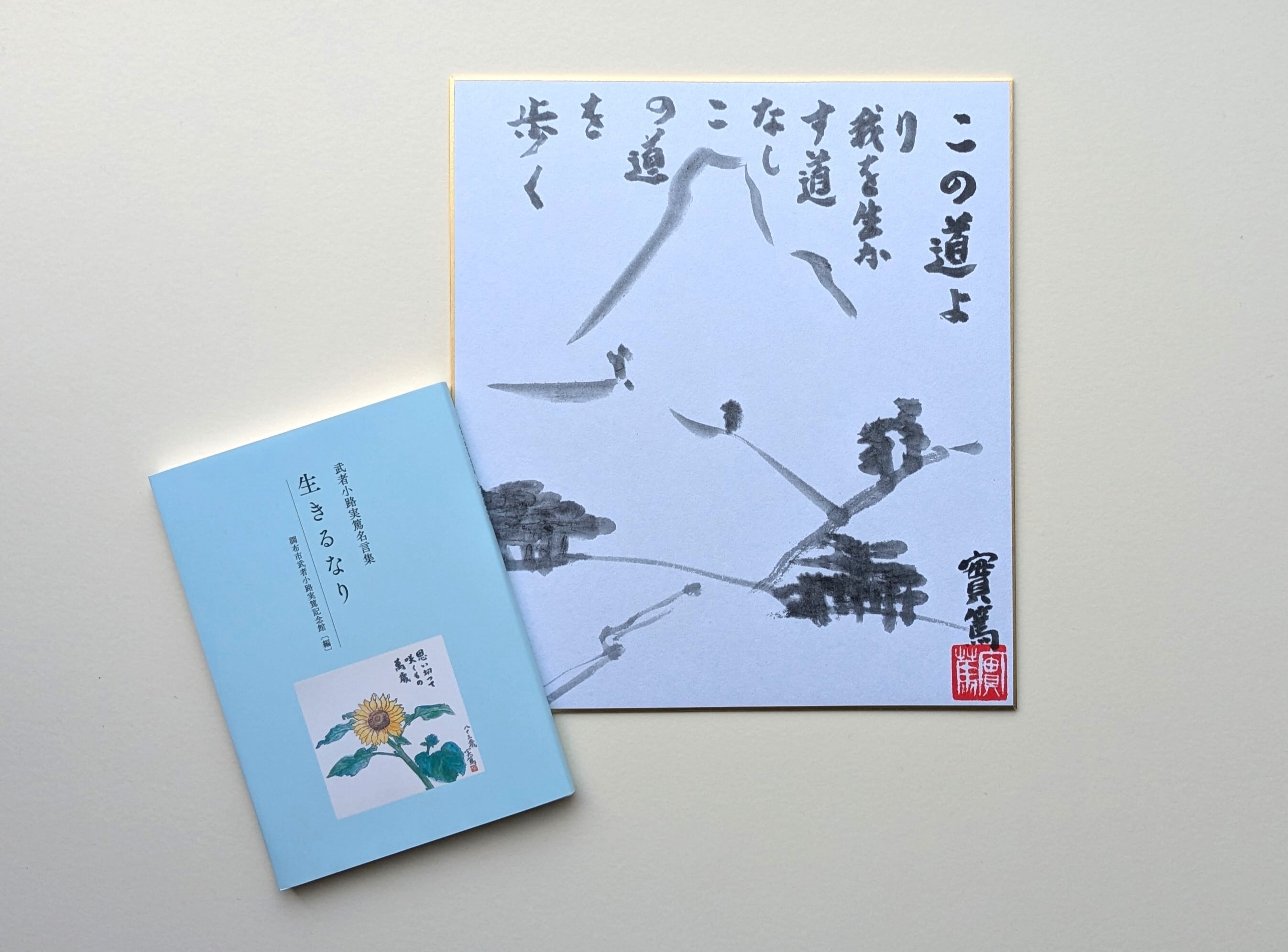 実篤の名言のなかでも、元気が出る言葉たちを選び、一冊にまとめた『生きるなり』と、『生きるなり』内にも登場する「この道」の色紙のセットです。